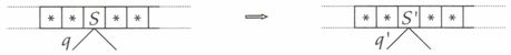 Une machine de Turing est déterminée par un ensemble d'instructions du type qSS′Xq′ (« si le symbole S est lu alors qu'on est dans l'état q, écrire S′, se mouvoir de 0 ou de 1 pas dans la direction X, et se mettre dans l'état q′ ») :