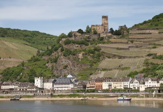 Au-delà de Bingen, le Rhin quitte le fossé d'effondrement et amorce la traversée du Massif schisteux rhénan par la « Trouée héroïque », vallée très encaissée, antécédente par rapport au soulèvement qui s'est continué jusqu'au quaternaire. Des barres de quartzites, notamment au Binger Loch, ont gêné la navigation jusqu'à ce qu'on les entaille artificiellement, à la fin du xixe s. Cette vallée du Haut-Rhin moyen, très pittoresque, avec ses vignobles et ses « burgs » en ruine, est aujourd'hui une grande région de tourisme et a été inscrite sur la liste du patrimoine mondial par l'Unesco en 2002. Le fleuve reçoit la Lahn (rive droite), puis, à Coblence, la Moselle (rive gauche), qui contribue, comme le Main et le Neckar, à atténuer le caractère alpestre de son régime. À Bonn, à la sortie du Massif schisteux rhénan, le Rhin entre définitivement en plaine. À Cologne, les crues sont plus étalées. Les maigres d'hiver disparaissent et font place à des maigres d'automne, peu accentués d'ailleurs. Les conditions sont excellentes pour la navigation, avec un débit de 1 120 m3s en basses eaux et de 1 750 m3s en eaux moyennes. Le fleuve dessine de gigantesques méandres dans le fossé d'effondrement du bassin de Cologne, au milieu des terrasses anciennes déformées et des terrains tertiaires à lignites. En aval de Cologne, une superficie représentant 15 % du bassin ne fournit au Rhin que 8 % de ses eaux, de sorte que le régime ne se modifie guère. La faible pente le régularise en provoquant un amortissement des crues. La pondération du régime n'exclut pas de forts écarts : crues (maximum de 13 000 m3s à Lobith, en 1926) et profonds étiages, certaines années. Les glaces qui se forment à l'aval, en hiver, perturbent souvent l'écoulement et peuvent produire des embâcles qui sont remontées quelquefois jusqu'à 300 km en amont de l'embouchure. Le Rhin reçoit la Ruhr (rive droite) à Duisburg, puis la Lippe (rive droite).