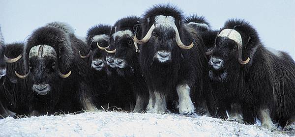 En cas de tempête, les bœufs musqués se replient dans une formation triangulaire ; le taureau dominant fait face en première ligne, s'installant dans l'angle le plus exposé, et les jeunes se mettent à l'abri entre les flancs des adultes afin de se protéger du vent.
