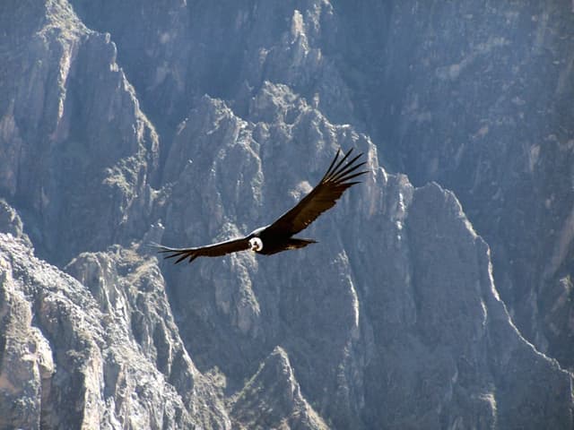 Dans ces régions désolées, qu'il est pratiquement le seul oiseau à habiter, le condor des Andes trouve tout ce dont il a besoin pour vivre : des parois abruptes où se blottir et des courants aériens indispensables pour pratiquer le vol à voile.
