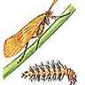 Larves : larves aplaties dorso-ventralement, antennes composées de 4 articles courts et massifs.