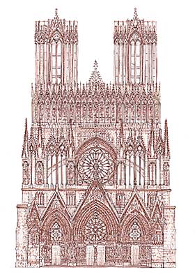 Cette dernière est le grand chef-d'œuvre gothique de Reims. La cathédrale carolingienne, reprise au xiie s., fut incendiée en 1210 ou 1211. Elle fut aussitôt rebâtie sur de nouveaux plans. Le labyrinthe autrefois pavé dans la nef donnait les noms de plusieurs architectes : Jean d'Orbais, Jean le Loup, Gaucher de Reims et Bernard de Soissons. Robert de Coucy leur succéda ; au xive s., on travaillait encore aux parties hautes de la façade, mais le monument est dans son ensemble une œuvre du xiiie s., dont la construction débuta par le chevet, terminé avant 1241.